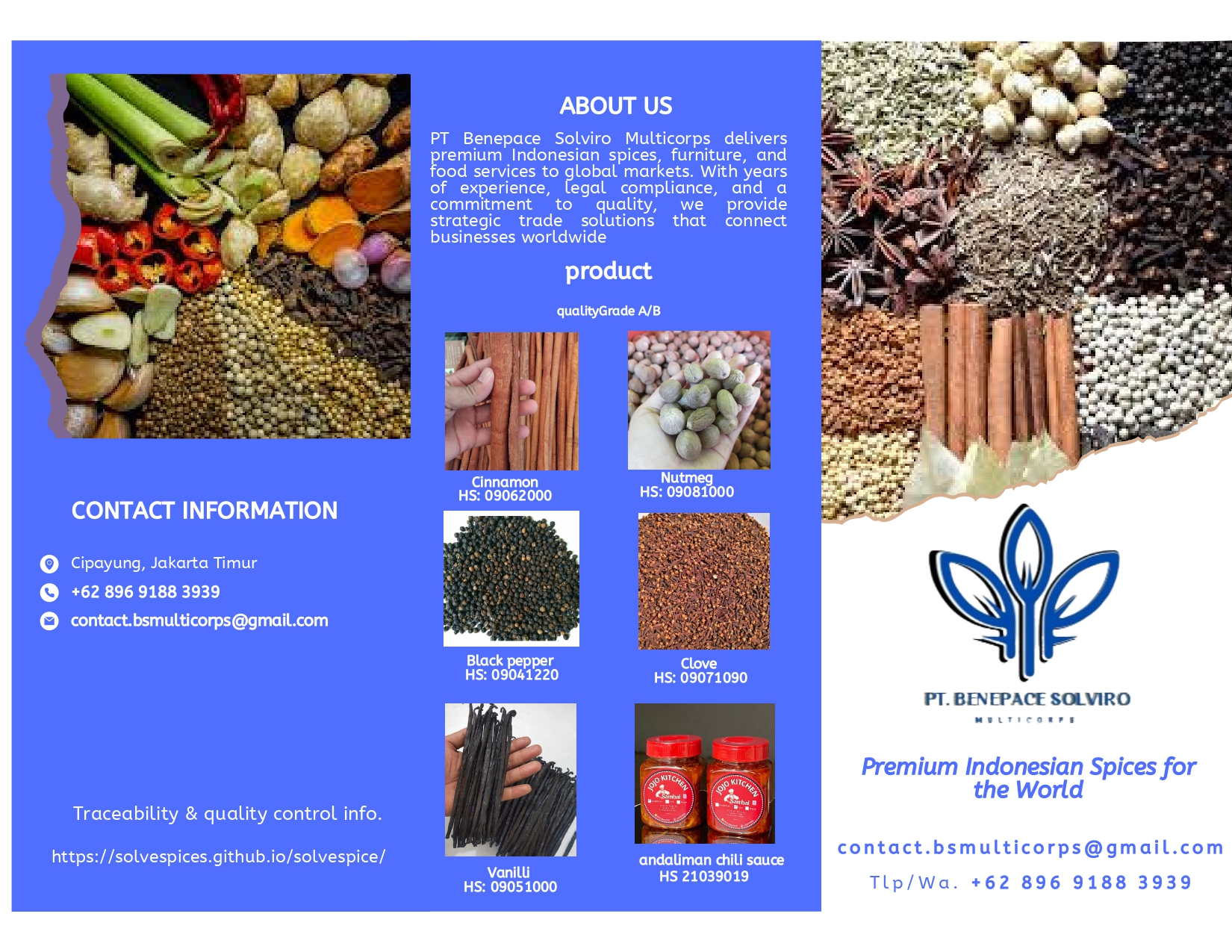 PT Benepace Solviro Multicorps adalah perusahaan yang bergerak di bidang perdagangan ekspor rempah-rempah, furnitur, serta jasa pengolahan makanan. Kami berkomitmen untuk menghadirkan solusi perdagangan yang efisien dan inovatif, dengan fokus pada kualitas produk dan pelayanan prima bagi klien B2B dalam menjangkau pasar global.